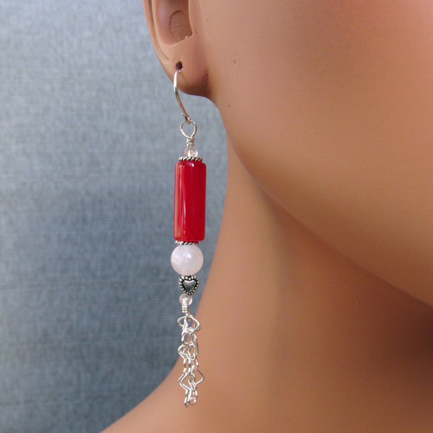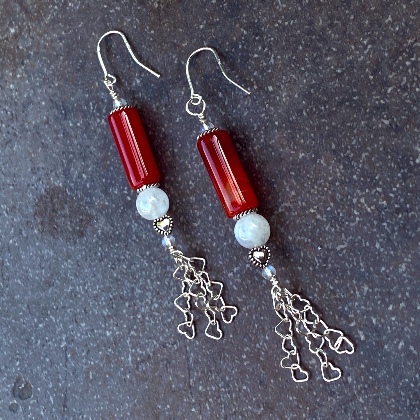 Red agate, moonstones, and sterling silver and filled with lots of hearts