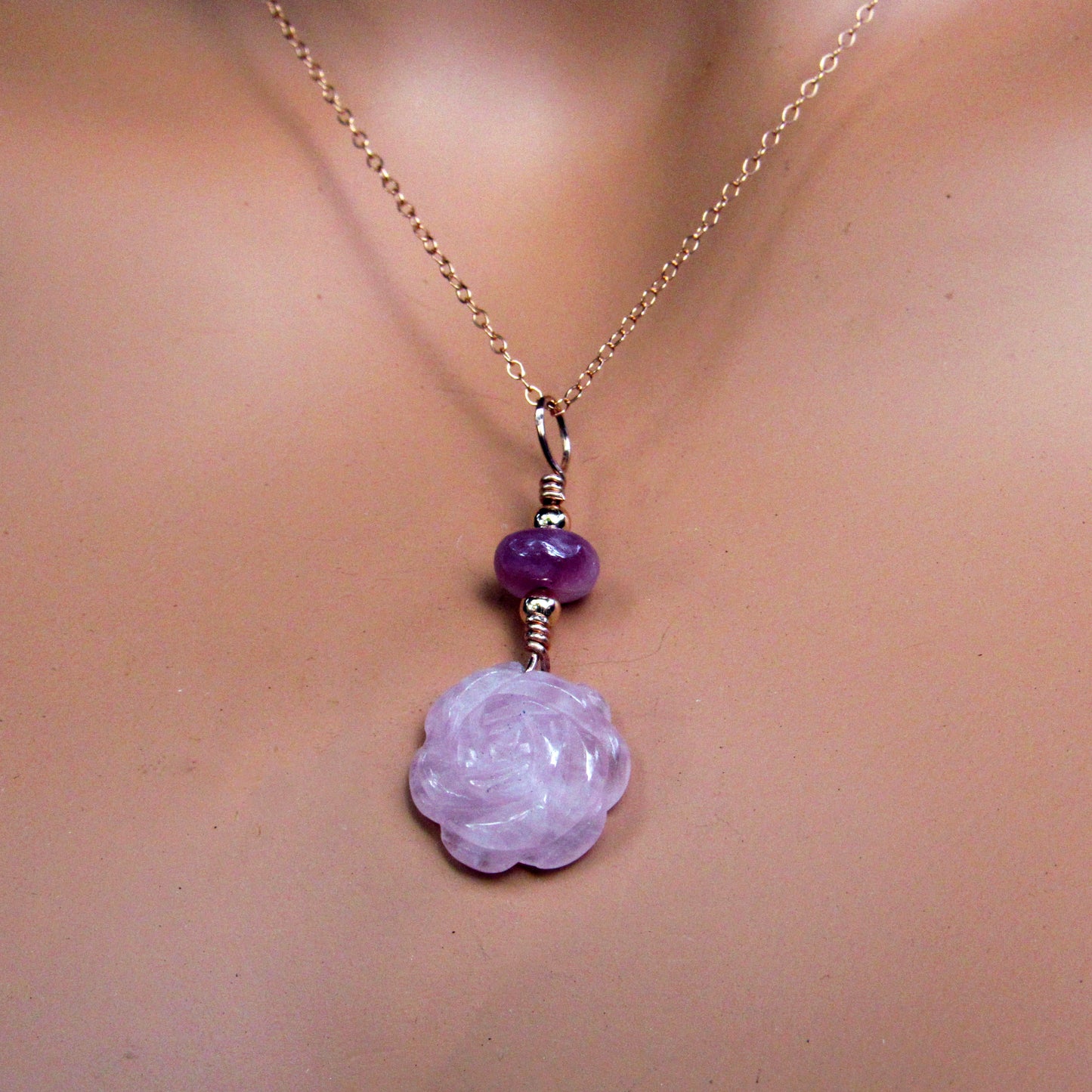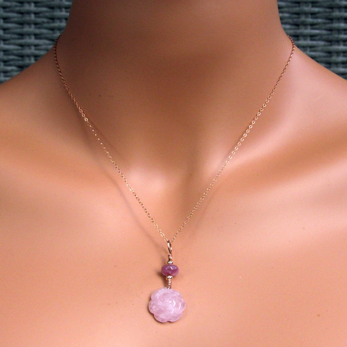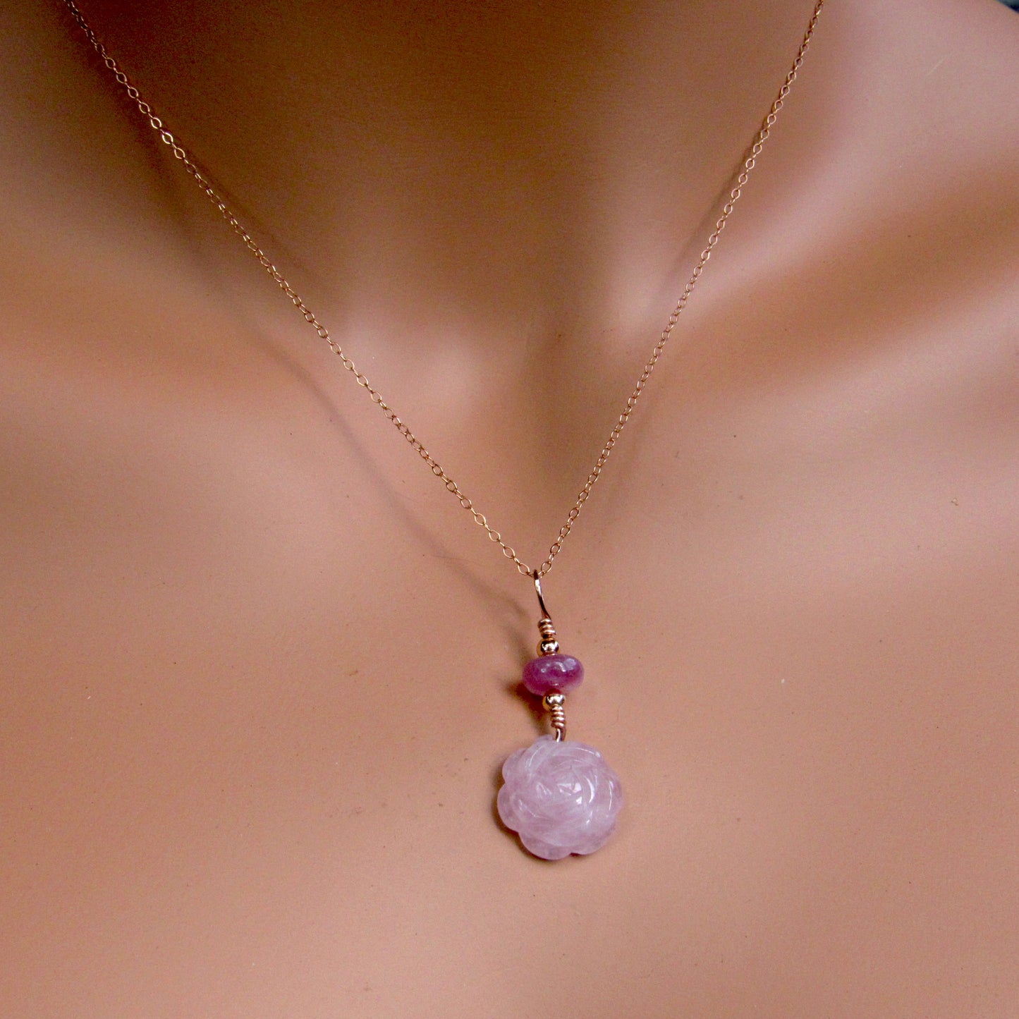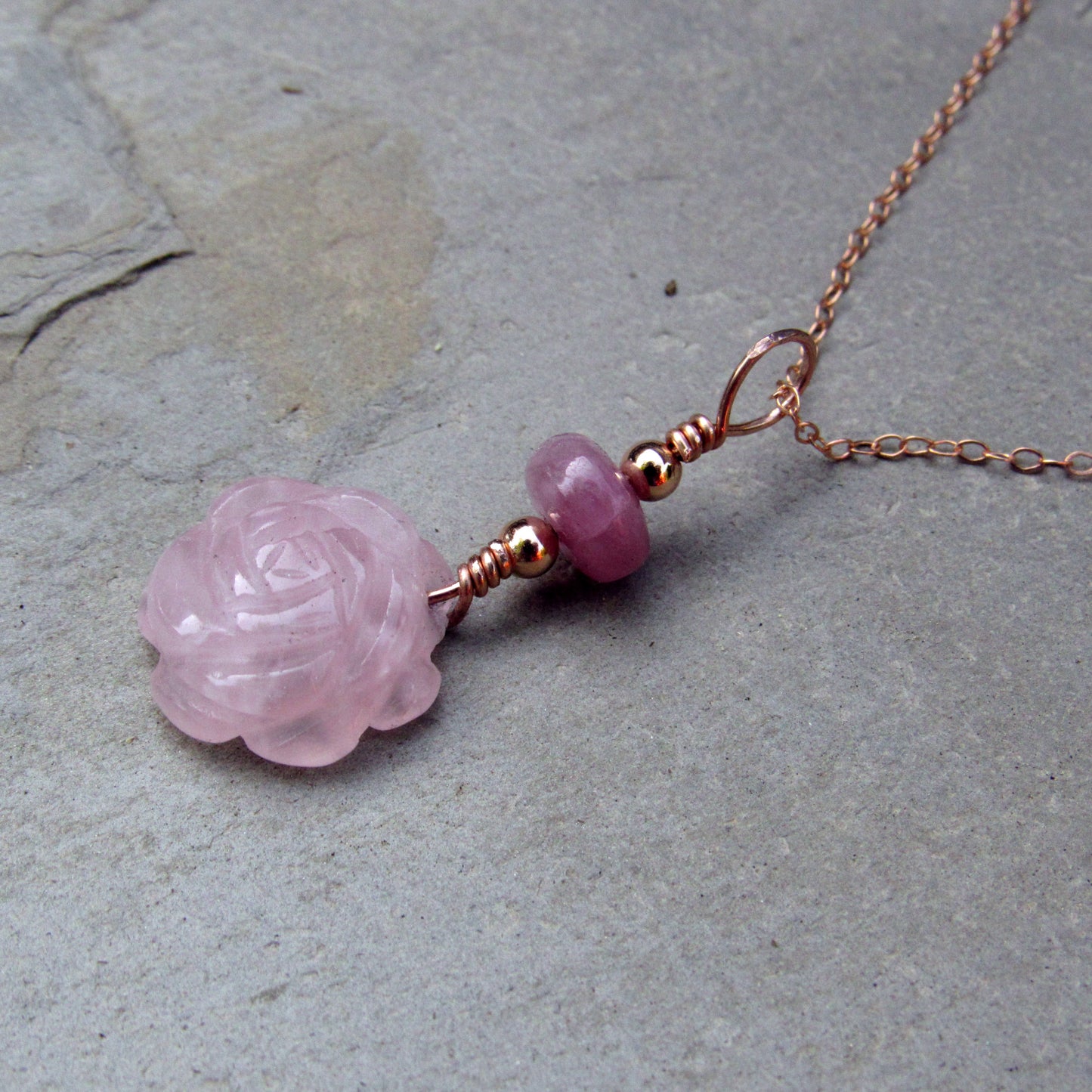 Rose Quartz Flower with Pink Tourmaline hand Wrapped on 14 Kt Gold Fill Necklace