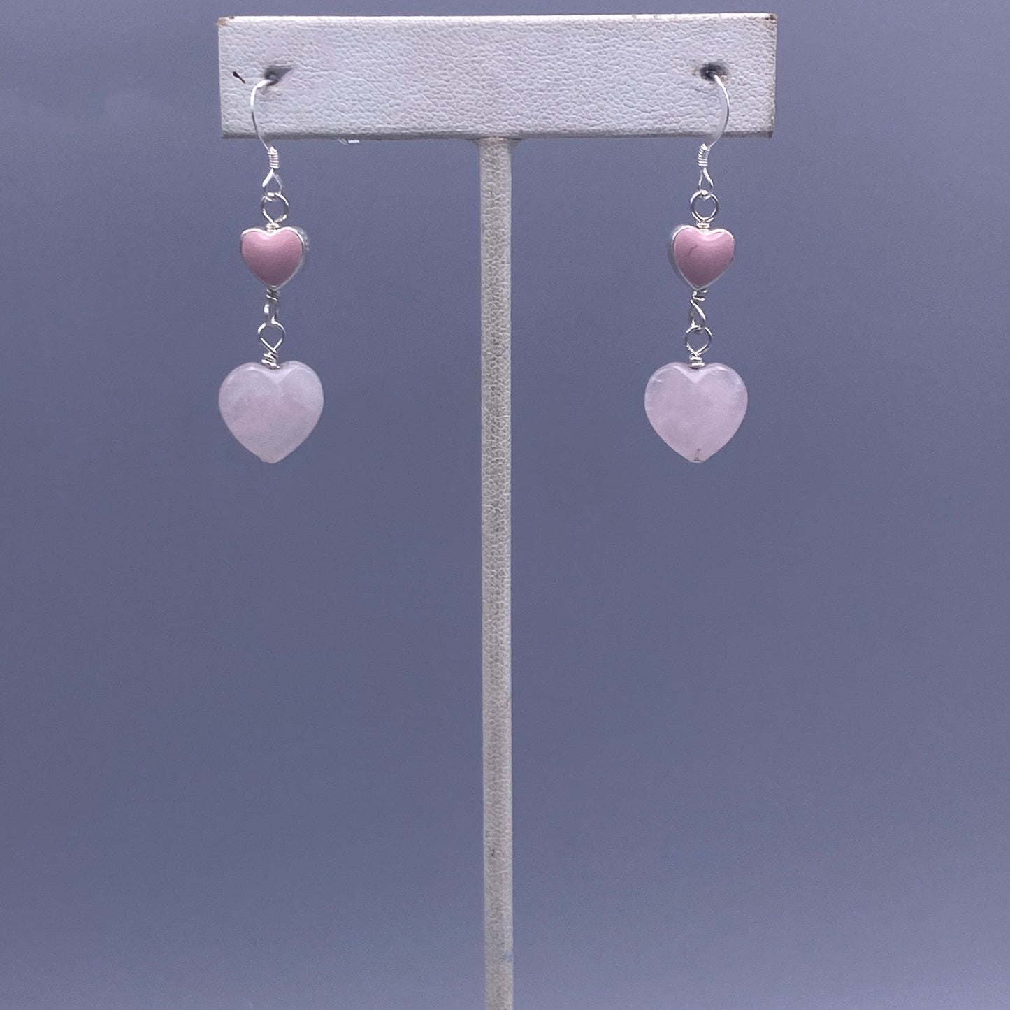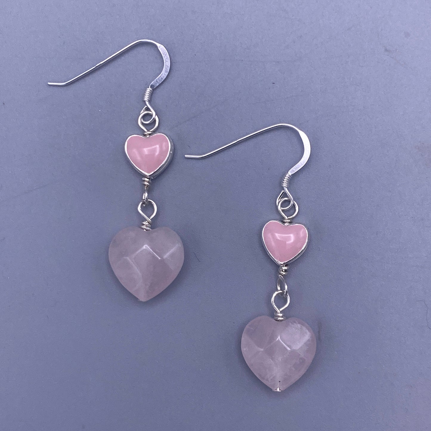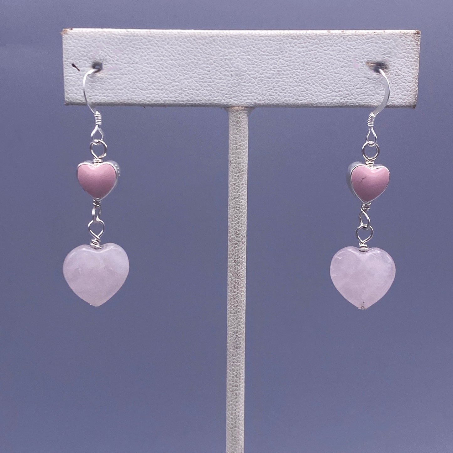 These dangle earrings feature a genuine rose quartz gemstone shaped into a heart, made with sterling silver.