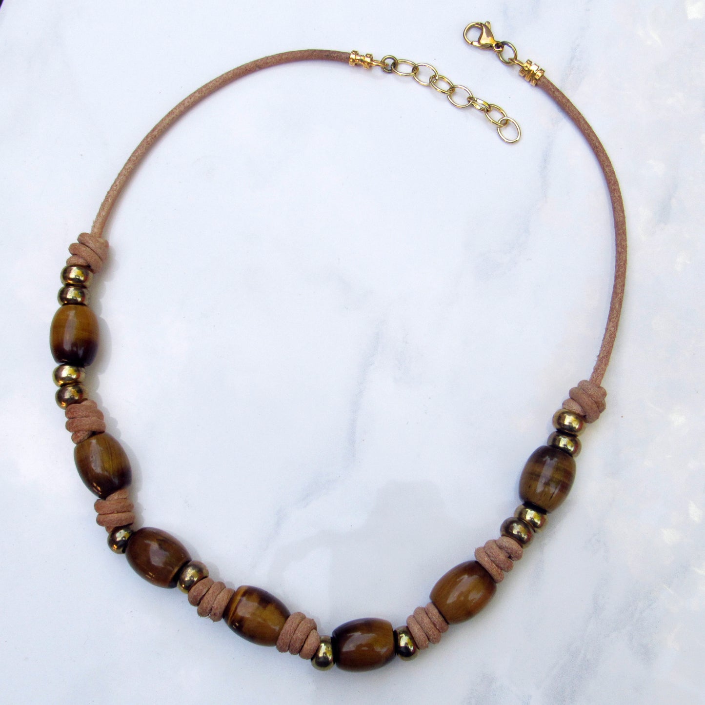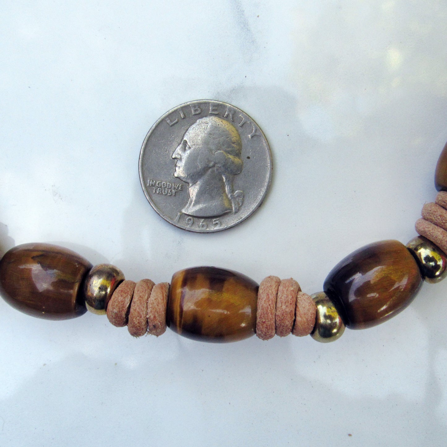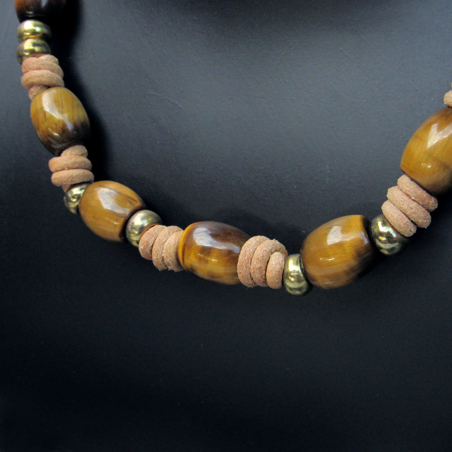 This is natural leather cord with genuine tiger eye and polished brass beads. Length is adjustable from 18.5”-20.0” with polished brass clasp and findings.