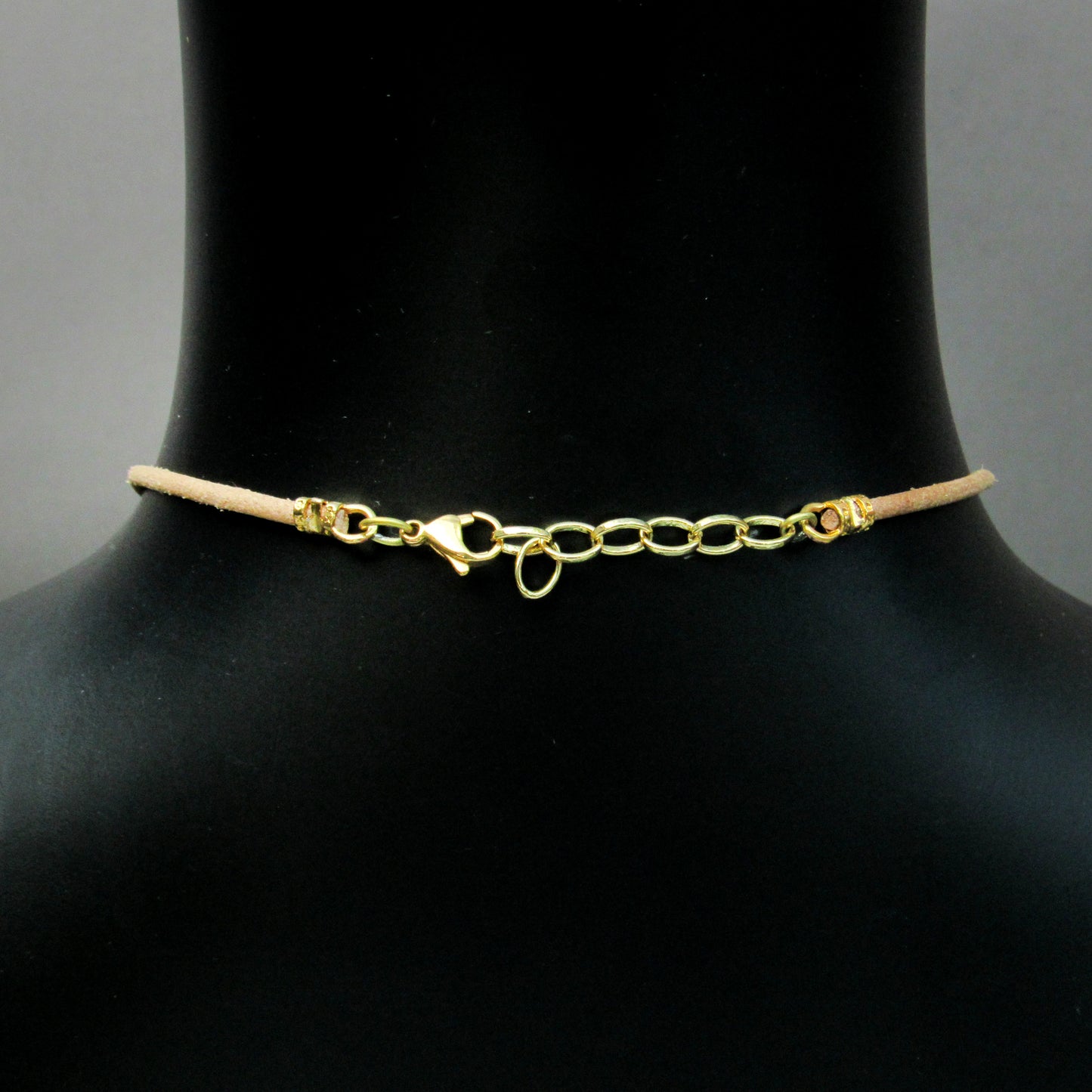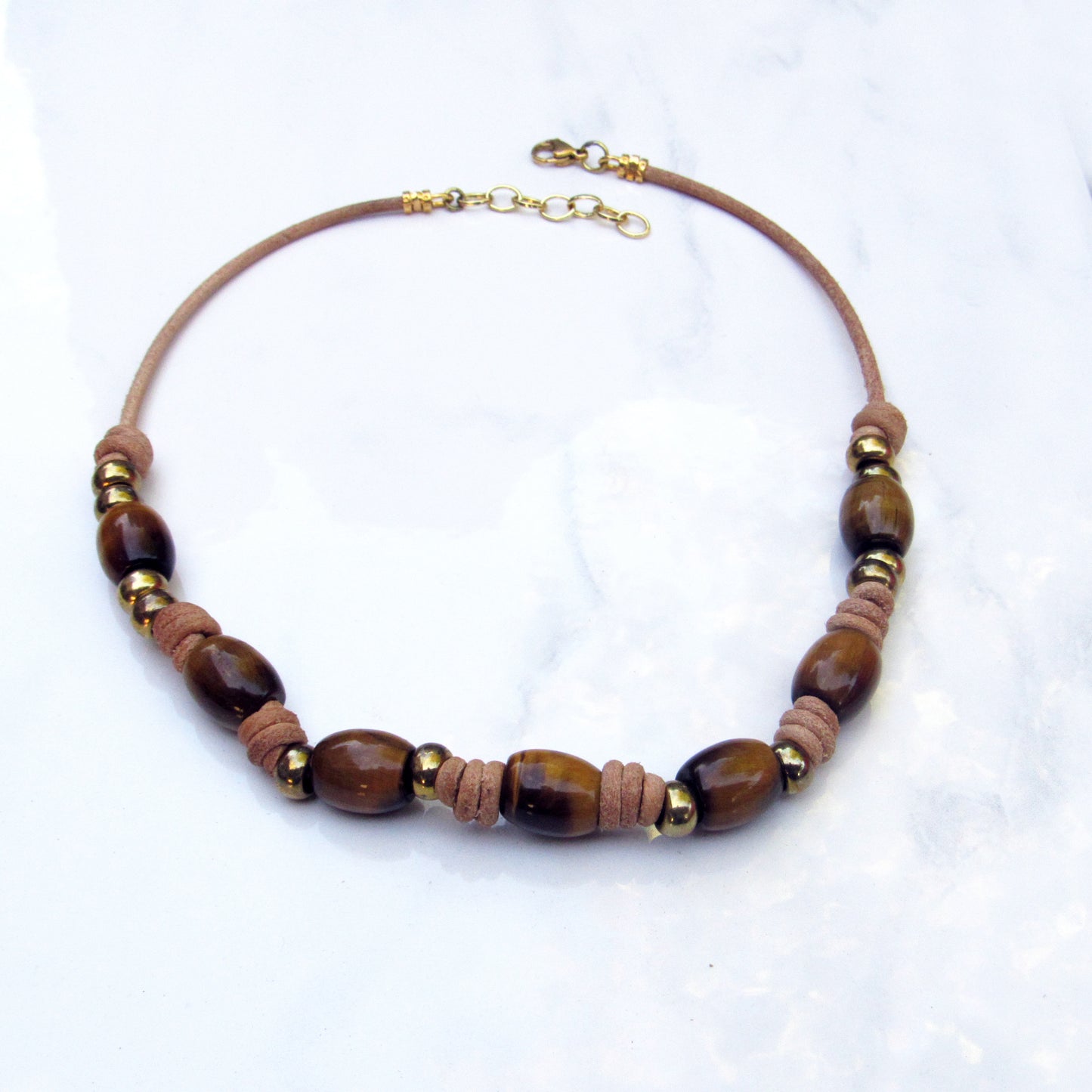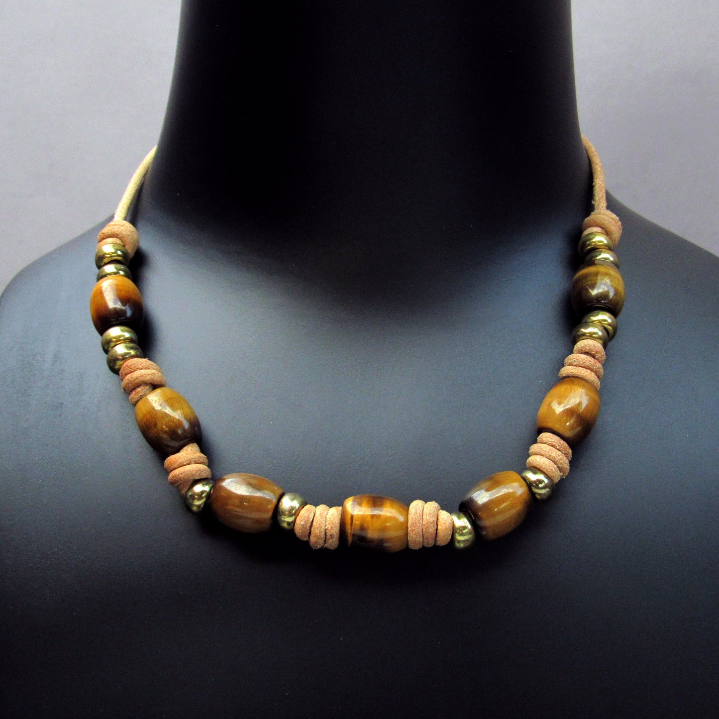 This is natural leather cord with genuine tiger eye and polished brass beads. Length is adjustable from 18.5”-20.0” with polished brass clasp and findings.
