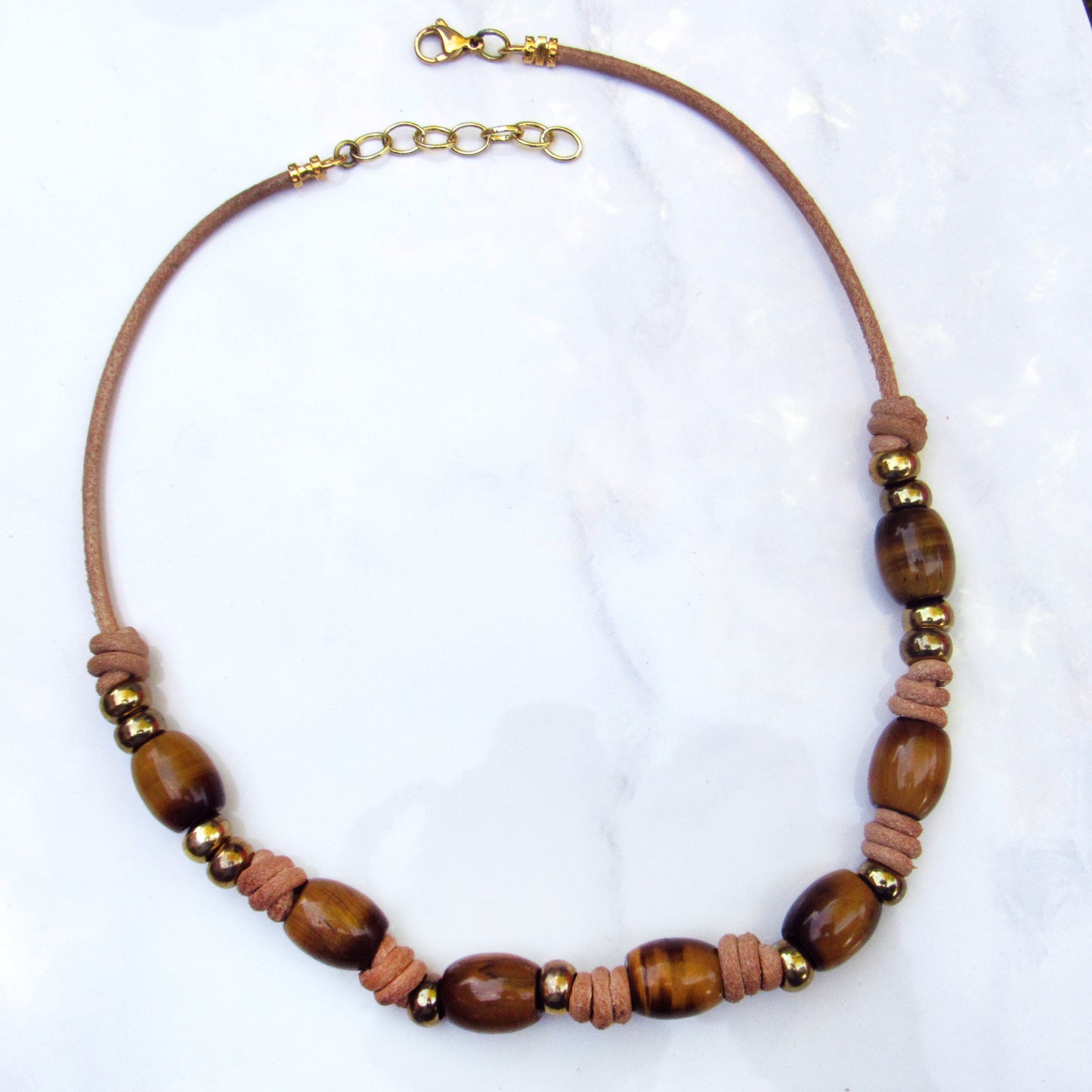 Tiger Eye and Brass Hand Knotted on Natural Leather Necklace