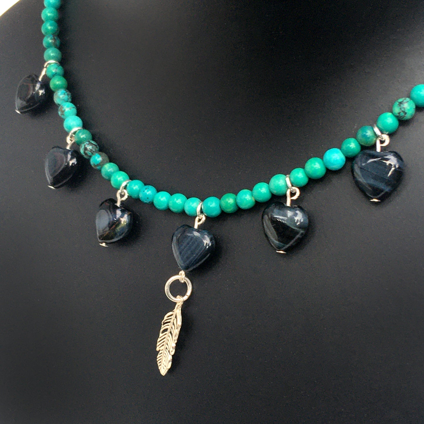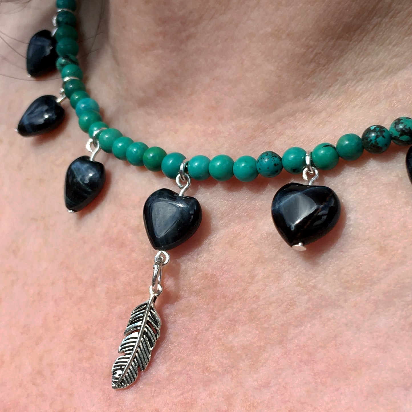 Women's Blue Tiger Eye heart Necklace with Turquoise with a Sterling Silver feather