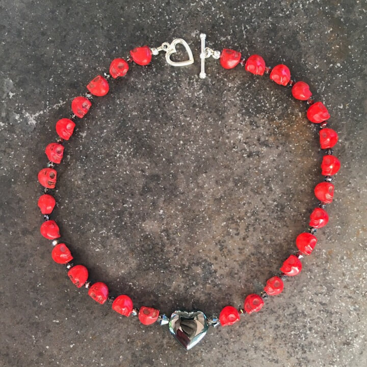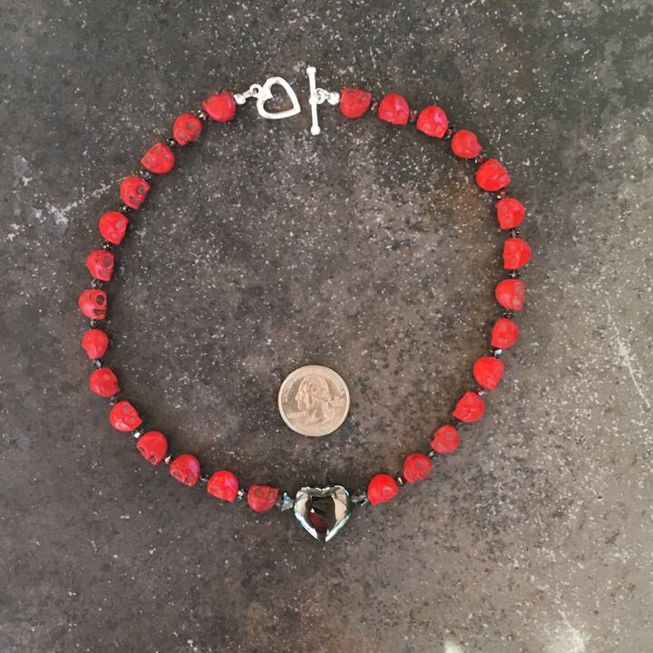 Women’s Red gemstone Skull Necklace with a Hematite Heart center piece.